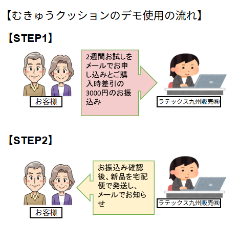 本サービスは、新品の車椅子クッション「むきゅう」を約2週間ご自宅でお試しいただき、継続購入または返品を選択できるサービスです。